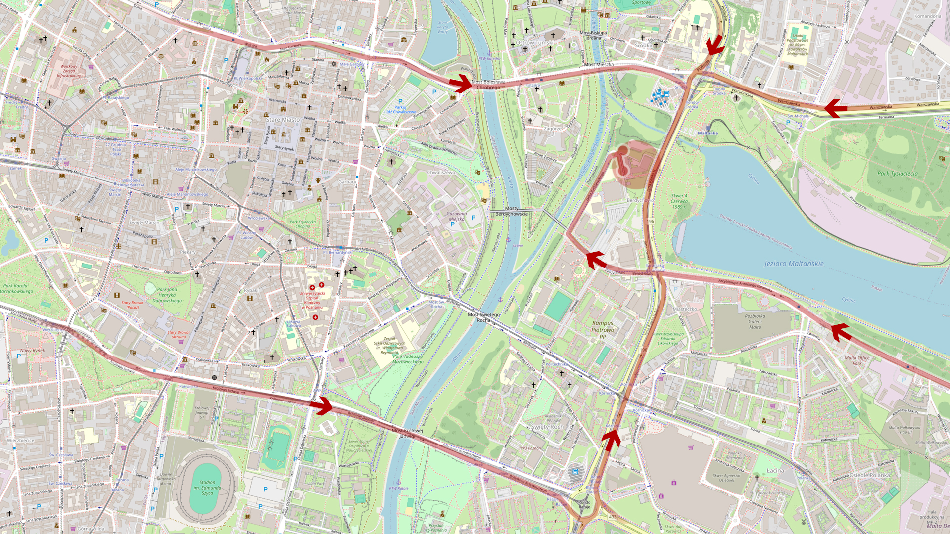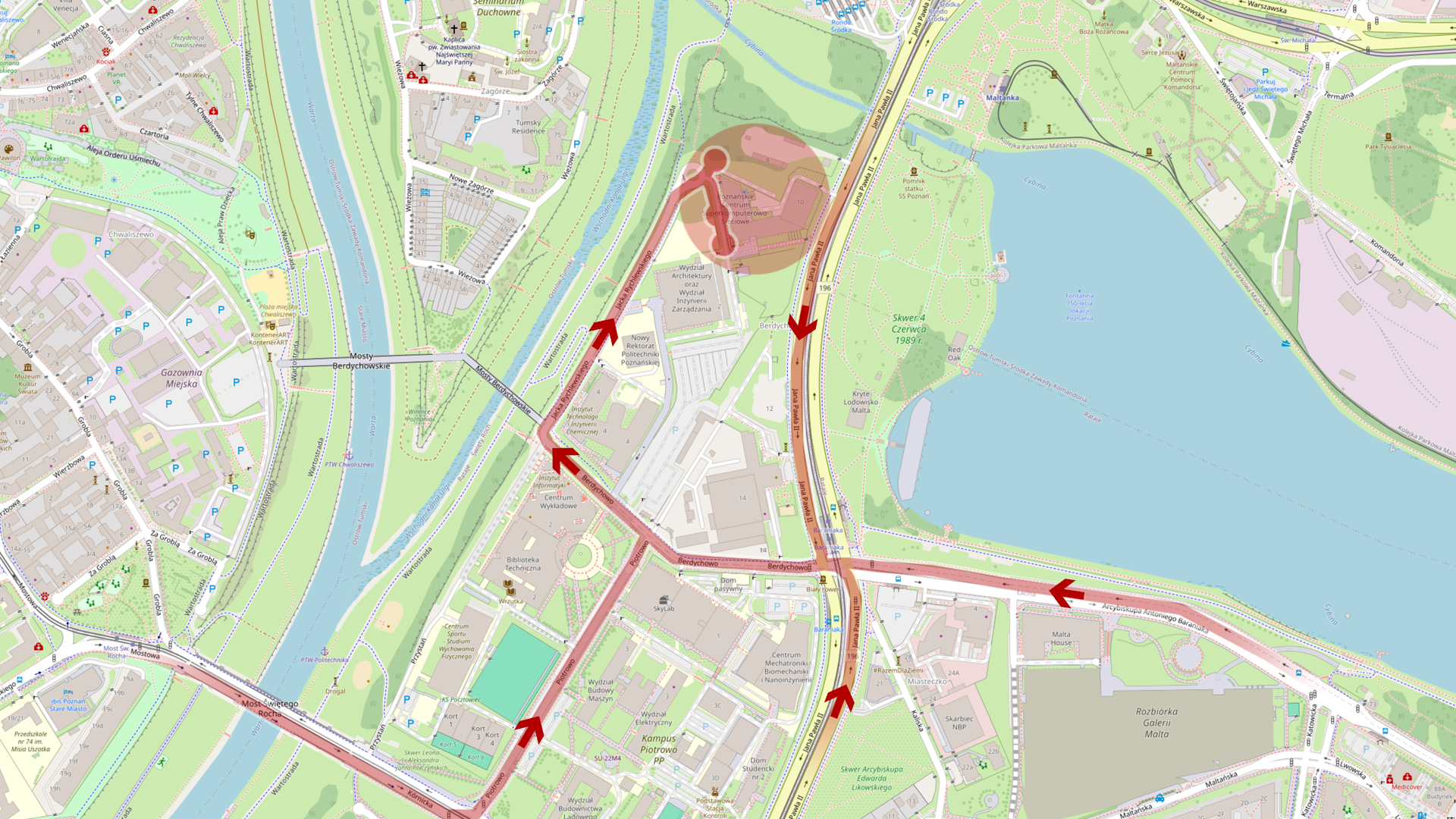 - wjazd główny; od strony ul.Berdychowo, należy minąć budynki Politechniki Poznańskiej, jadąc wzdłuż brzegi rzeki ulicą Jacka Rychlewskiego docieramy do małego ronda przy budynku; stamtąd należy kierować się na kamienisty, specjalnie oznaczony parking dla gości, lub ulicą wewnętrzną wzdłuż budynku na zarezerwowane uprzednio miejsca postojowe dla gości.